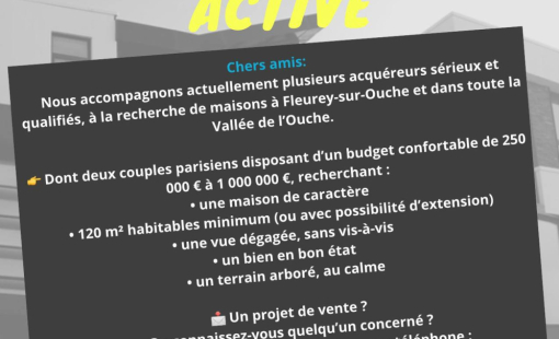 Nous accompagnons actuellement plusieurs acquéreurs sérieux et qualifiés, à la recherche de maisons à Fleurey-sur-Ouche et dans toute la Vallée de l’Ouche.
